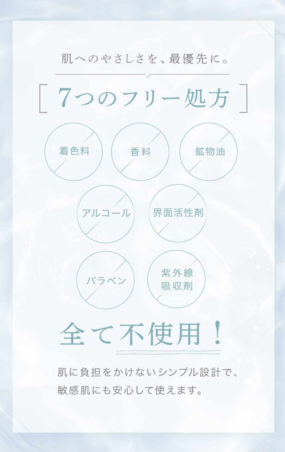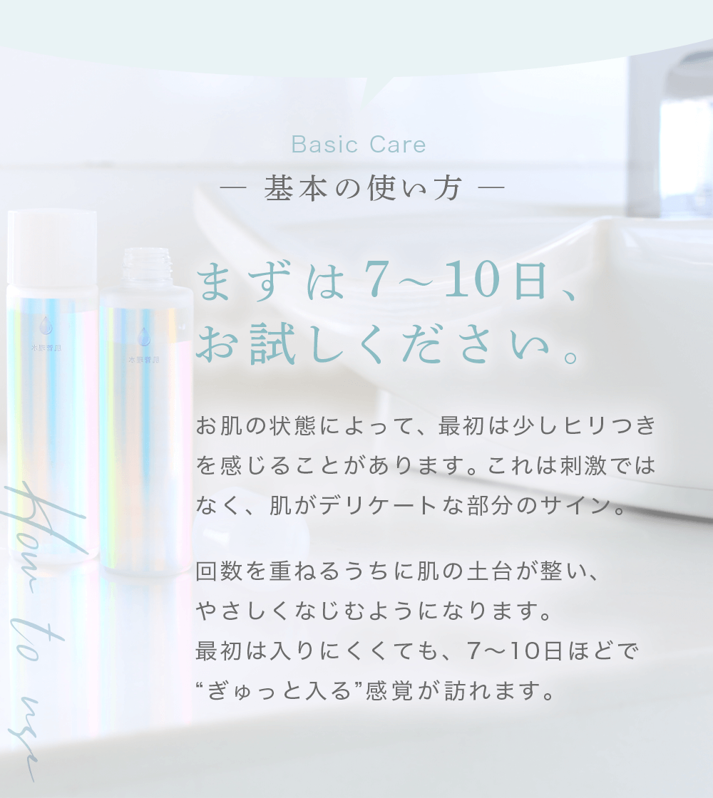 初めて使用する際は、赤みひりつきが出たり、肌に入っていかず、はじく感覚がございます。7日〜10日ほどで急に肌に入る感覚が出てきます。それがお肌の土台が整ってきたサインです。