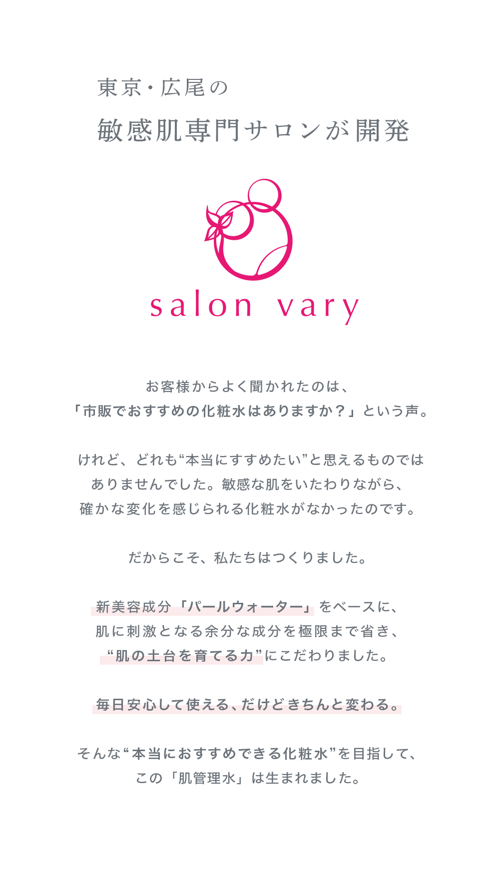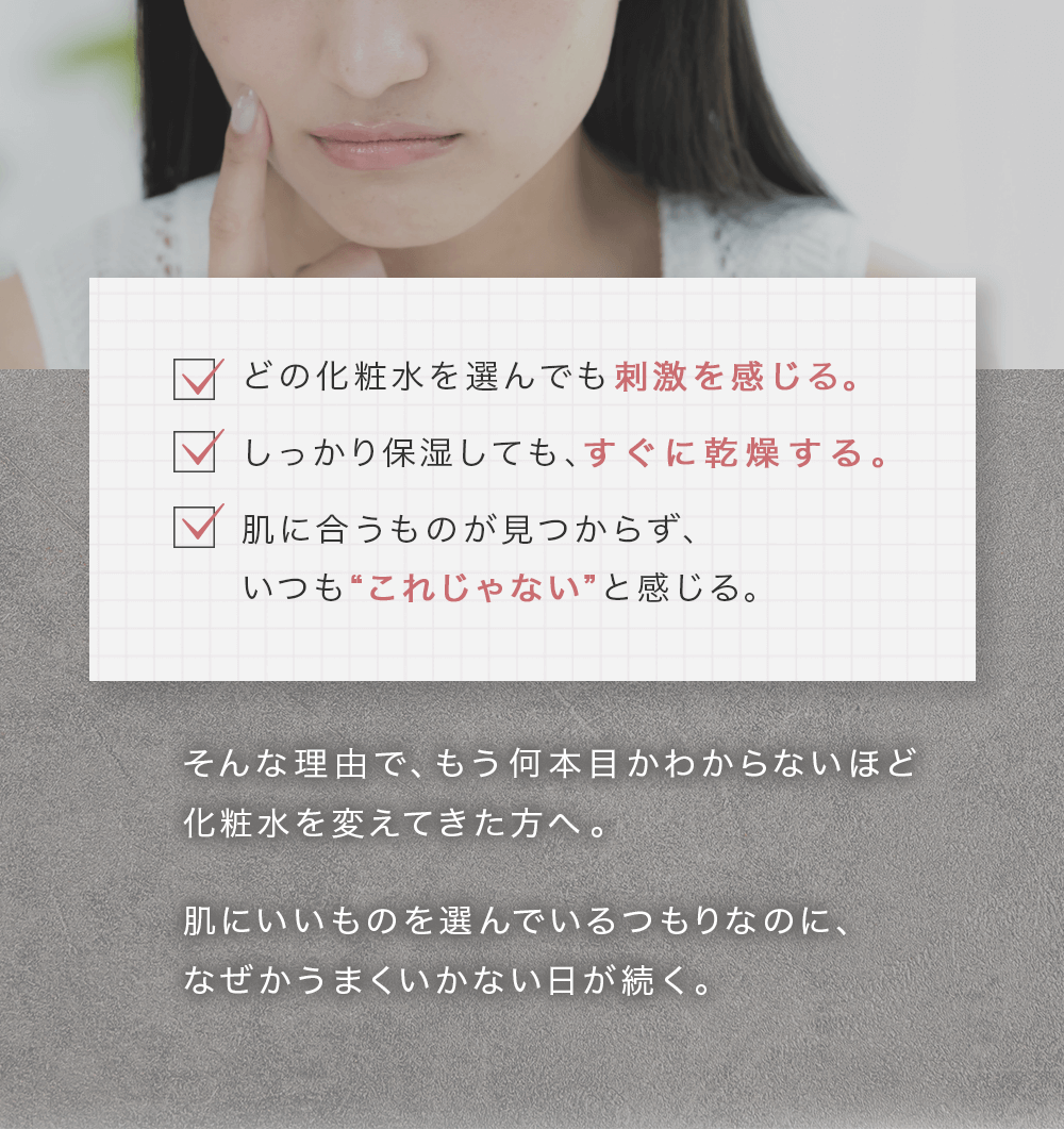 敏感肌の私の肌にとても相性が良く、感覚がありました。今まで使ってきた化粧水との実感があります。で、安心して使い続けたいです。